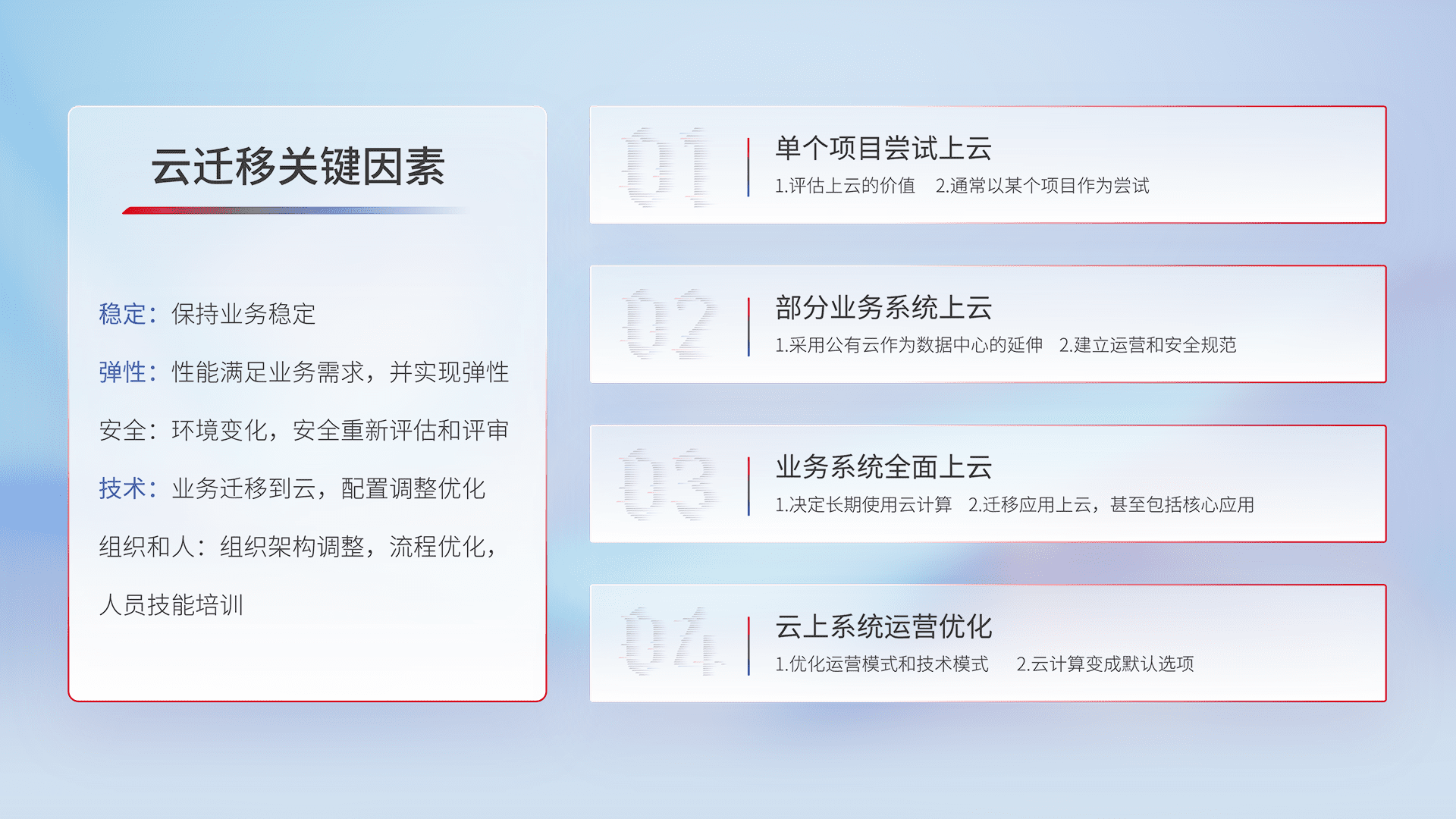 结合实际业务,,,从规划设计、、云平台选型、、、、云原生改造、、数据迁移、、集成交付,,迁移全过程为客户识别最佳上云路径,,,,做好风险识别管理,,,,设计网络架构、、、身份权限、、、、安全审计合规、、、操作审计、、、日志审计、、、、监控告警策略、、多站点容灾设计等,,对云上基础设施进行整体规划,,,提升IT治理水平,,以满足弹性、、、、高可用、、、高性能的需求。。